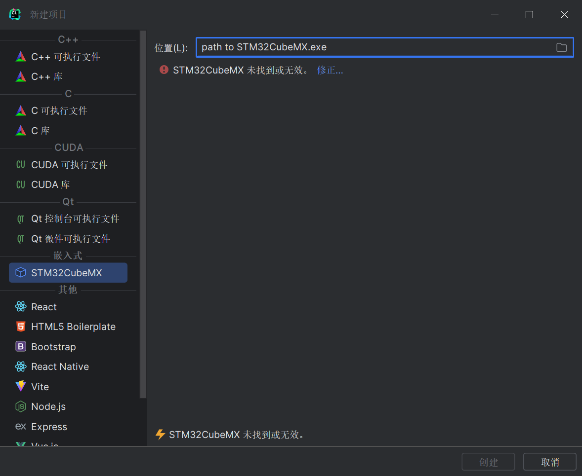 选择新建项目,在左侧边栏选择 STM32CubeMX,此时需要在右侧指定项目的位置: